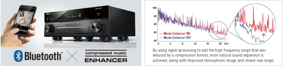 When music is encoded into a digitally compressed format like MP3, the frequency response suffers. Yamaha’s Compressed Music Enhancer employs sophisticated digital signal processing using exclusive algorithms to restore what was lost, so the music always sounds the way it should.