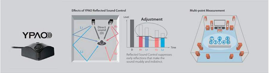 YPAO-R.S.C. analyses room acoustics and measures various speaker characteristics, then calibrates audio parameters to achieve optimum sound at any of eight listening positions. It employs Reflected Sound Control to correct early reflections for studio-quality sound. It also provides DSP Effect Normalisation, which varies the CINEMA DSP parameters according to the reflected sounds.