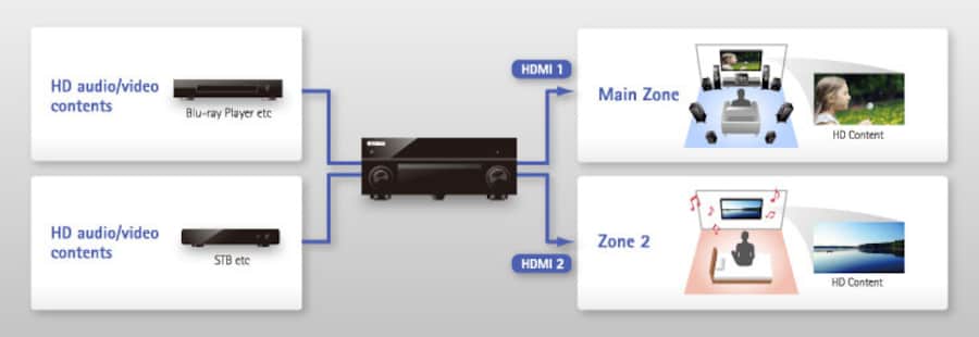 HDMI zone switching offers the ability to individually select and send HD video programmes to two separate zones. Watch a Blu-ray Disc™ movie in the Main Zone while an HD cable TV broadcast plays in another room (Zone 2).