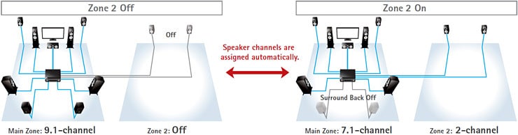 Intelligent Amp Assign automatically assigns amplifier channels to certain speakers, depending on what functions are selected. For example, in a 9.1-channel system, when Zone 2 is off, all 9.1 channels will be used in the Main Zone. However, when Zone 2 is on, power to the two Surround Back channels will be directed to the two speakers in Zone 2, and the Main Zone will receive 7.1 channels of power. Similarly, when CINEMA DSP HD3 is on, the two Rear Presence speakers will be powered and not the two Surround Back speakers. When CINEMA DSP HD3 is off, this situation is reversed. Thanks to Intelligent Amp Assign, there’s no need to switch the speaker cables on the rear of the receiver—one more way Yamaha makes your life a little easier.