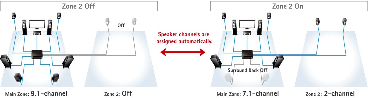 Automatically adjusts bass and treble balance to match the volume on system in other rooms (Zone 2). Enjoy movies and music with a natural sound quality balance even at low volumes.