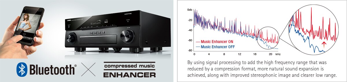 This AV receiver is equipped with Bluetooth functionality to let you enjoy easy wireless music playback from smartphones and other devices. The Compressed Music Enhancer from Yamaha is now optimized for Bluetooth audio transmissions to ensure that your music will have vivid, lively sound quality during wireless playback.