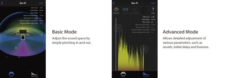 This AV receiver is equipped with a variety of sound programmes that utilise Yamaha's original DSP technology. They allow you to easily create sound fields like actual movie theatres or concert halls in your room and enjoy natural stereoscopic sound fields. Now you can use the AV Controller app to adjust DSP parameters to your preference to match the type of music / movie or the mood you want to achieve. There are two modes, Basic and Advanced, that you can choose according to the type of adjustments you want to do.