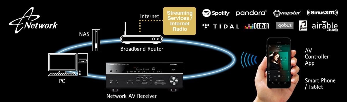 This AV receiver provides a variety of network functions that enable you to access more sources and also enhance operation. You can connect the receiver to your home network or internet to enjoy Internet Radio, Spotify*, Pandora®*, Napster®*, SiriusXM*, Tidal*, Deezer* or music stored on a NAS and home PC. The AV Controller app (from iTunes® App Store or Google play) lets you control various functions from your iPod®, iPhone®, iPad® or Android™ phones / tablets.