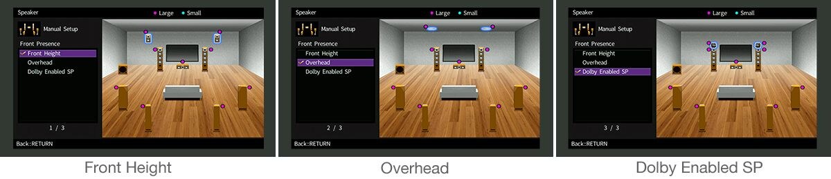 Yamaha provide multiple placement patterns for presence speakers that support Dolby Atmos, creating a sound field that’s ideal for your setup. Any layout can be appropriately reproduced, including the three-dimensional space of CINEMA DSP as well as Dolby Atmos.