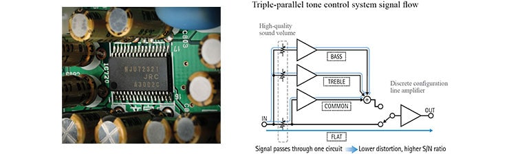 We’ve utilised a high-quality digital volume control specially designed by New Japan Radio Co., Ltd., which consists only of ladder-type resistance, removing the impact of slew-rate decline or colouring of the sound, delivering higher purity in the sound, and excellent, fast response to large volume changes and steep transients. Moreover, the tone controls employ a triple-parallel method, minimising the detrimental impact on sound quality seen with straight-line tone controls. In addition, the bass, treble, and common circuits each utilise simple construction in which the NFB of the amp is not used and the CR elements are simply fixed in a straight line, ensuring exceptionally pure sound reproduction even when tone control is applied and superb response to audio signal transients. When tone defeat is applied, straight signal flow from only one volume circuit to a discrete configuration buffer amp is realised.