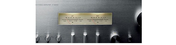 The centre of the main unit features level meters that provide visual enjoyment of the music as well, with the rapid and delicate movement of the needles. The meter is illuminated softly from inside by LED, giving a warm, beautiful lamplight look. The meter indicators can, along with VU display, be switched to peak display, and can be selected according to your preferences. The window of the meters has been precision-fit to the panel—completely flat, with no gaps—for an elegantly beautiful appearance.