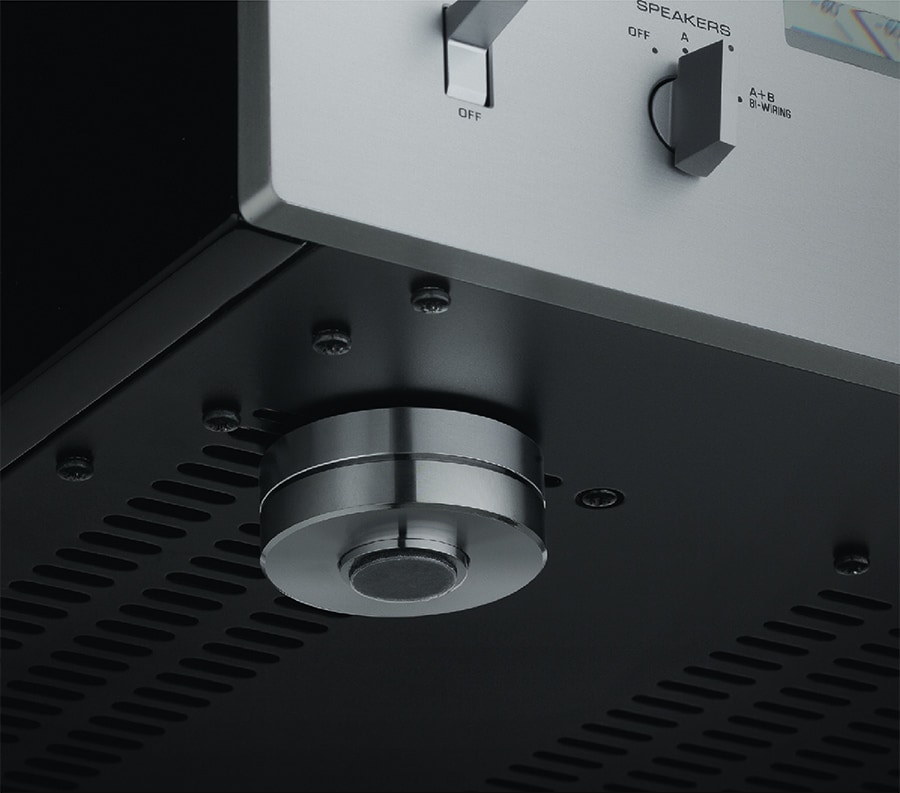 The feet are no exception. Original in its design, the heavy-duty brass feet function either as fully supported spikes or with a scratch guard base for use on delicate surfaces.