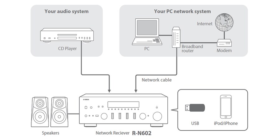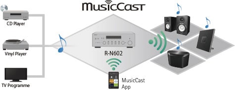 MusicCast employs a high performance wireless network to deliver music and audio enjoyment. It can stream digital music content from your smartphone, PC or NAS to other MusicCast devices in your home. It can also share the music from external devices such as a CD player or TV connected to the R-N602. Audio content from Bluetooth-connected smartphones or tablets can also be streamed to MusicCast devices in multiple rooms.
