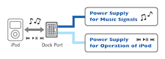 The iPod dock has an independent power supply to prevent operating or charging current from the iPod from flowing into the amp ground signal. This ensures optimum iPod sound quality.