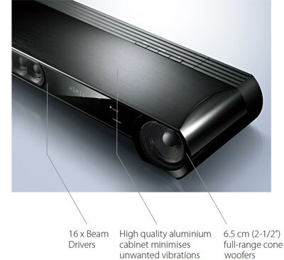 The soundbar uses 16 array speakers controlled by Yamaha's YSP technology plus two powerful 6.5cm woofer units in the large cabinet to deliver excellent sound quality with clearly positioned dialogue and superb surround effect. The aluminium body dampens unwanted vibrations. The result is an expansive sound field that will thrill you with its three-dimensional properties and outstanding imaging.