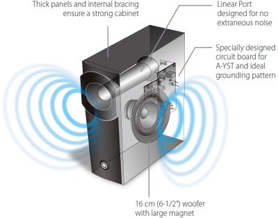 The subwoofer has a large 16cm driver and uses Yamaha's exclusive Advanced YST technology to produce clear, powerful bass. The circuit board has an ideal grounding pattern that ensures stable current supply. The Linear Port improves sound dispersion and is designed to minimise unnecessary noise. Both music and movie sound effects are reproduced with an astounding sense of presence.