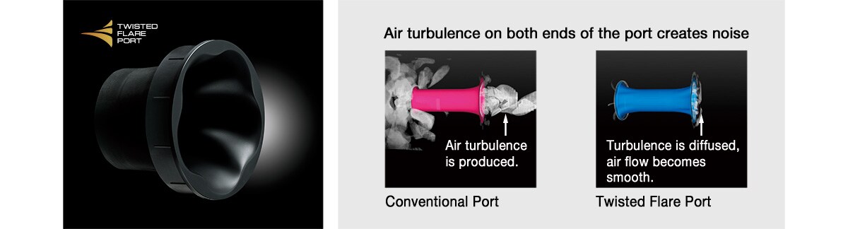 The all-new Twisted Flare Port takes advantage of extensive subwoofer development experience. The flared, gently twisting shape diffuses the vortex of air generated around the edge of the port, creating a smooth flow of air. This reduces extraneous noise not present in the original input signal and provides clear, accurate low frequency reproduction. From special effect sounds in movies to the atmosphere of a live venue, you hear bass that is clear, tight and realistic.