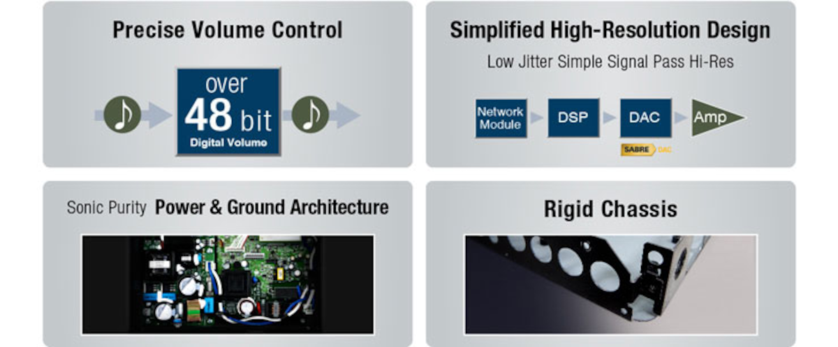 The WXA-50 reaps the benefits of Yamaha’s advanced audio technologies and circuit designs. The preamp circuitry, for example, minimizes digital jitter and uses the same high performance ESS DAC that is found in high-end AV receivers. Yamaha’s proprietary power supply ground configuration, called DAC on Pure Ground, ensures that the power supply will never negatively affect sound quality. The 48-bit digital volume control provides much greater precision and quality that conventional digital or analog controls. In addition, a highly rigid, metal chassis supplies the stability necessary for powerful, clear music reproduction.
