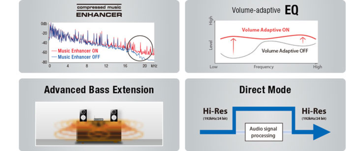 Thanks to Yamaha’s superior sound processing technologies, you’ll enjoy great sound from all your music sources — no matter what their quality, or your listening environment, or the kind of speakers you’re using. When listening to audio from smartphones or other compressed sources, the Compressed Music Enhancer greatly improves the sound at all frequency levels. Volume-adaptive EQ automatically adjusts the bass / treble balance according to the volume level. Advanced Bass Extension provides a deeper, richer low-end sound — it’s great for compact or in-wall speakers. And a Direct Mode allows you to play back high-resolution audio sources just as they are without any processing.