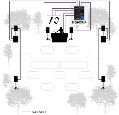 This setup is deceivingly powerful for such a portable, user-friendly PA system, with enough output power to deliver clear, energizing recorded music playback for mid-sized outdoor parties/DJ events, etc. for an audience of up to 100 people depending on seating/venue size.