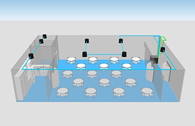 In this application the area is divided into two zones: the main seating area is zone 1, and the entrance, washrooms, and kitchen are zone 2. Volume can be individually adjusted for each zone, so Zone 1 can be adjusted according to the number of customers present while the Zone 2 volume remains constant.