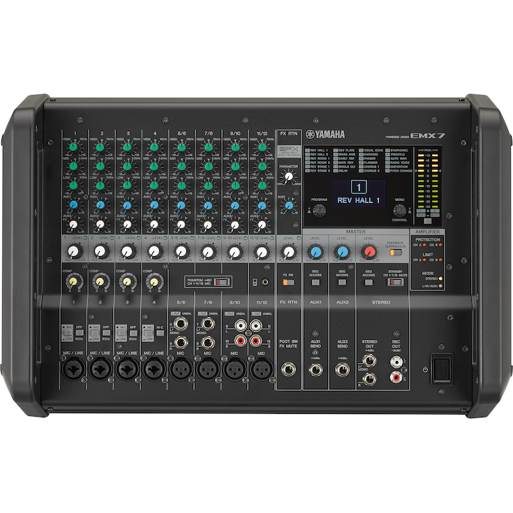 Box-type robust and portable powered mixer featuring high efficiency power amplifier of 710W and mixer with comprehensive effects, Flex 9 Graphic Equalizer, speaker preset and built-in feedback suppressor.