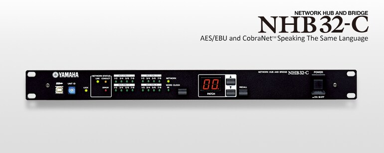 • Up to eight NHB32-C units can be networked, with each unit transferring and receiving four bundles, and 64 channels of digital audio can be received from any ACU16-C or NHB32-C on the network via CobraNet™.