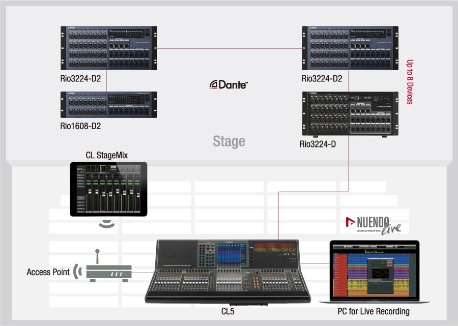 In RIVAGE PM systems it is possible to combine and simultaneously operate Rio3224-D2/Rio1608-D2 units connected via Dante, and RPio622/RPio222 units connected via TWINLANe. A Dante network can accommodate up to 24 Dante devices, including Rio3224-D2/Rio1608-D2 units, while a TWINLANe network can connect up to eight RPio622/RPio222 units. The entire system can operate at 96 kHz.