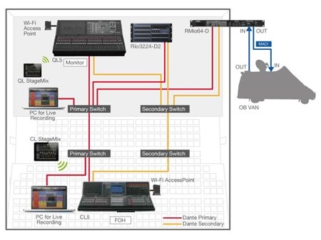The live sound system includes a CL console at front of house and a QL console stage side. In addition to providing the monitor mix, the stage side QL console’s Port to Port feature allows it to function as an I/O device with capabilities comparable to an R series rack unit, thus reducing overall system size and complexity.The RMio64-D converts the system’s Dante signal to MADI for transmission to the OB van outside the venue. Sample rate conversion built into the RMio64-D effectively resolves word clock synchronization issues.