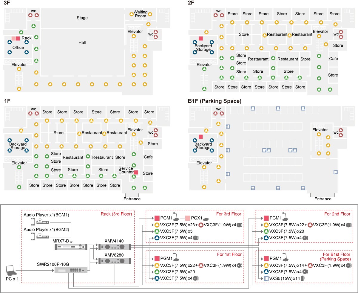 SWR2100P series switches not only make it easier to design and install audio network systems, but result in more convenient and controllable installations as well. A combination of MRX7-D and XMV devices is ideal for large-scale applications such as shopping centers. In this system, Dante compatible PGM1 units can be added to provide multiple remote paging stations. In the setup shown, a PGM1 unit located in the 3rd floor office is set up as a master station that will take priority over all other PGM1 units for emergency announcements. The VXC3F and VXS5 speakers allow high-impedance connections, making it possible to distribute multiple speakers over a wide area for broad coverage. A tap on the speakers allows output wattage to be easily changed to create the desired BGM and announcement balance, even after installation.