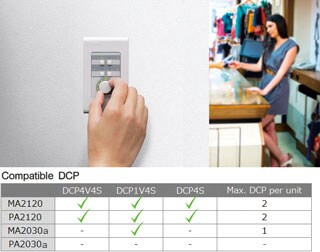 - Optional DCP control panels allow convenient remote volume control, microphone ON/OFF switching and chime activation (PA2030a excluded)