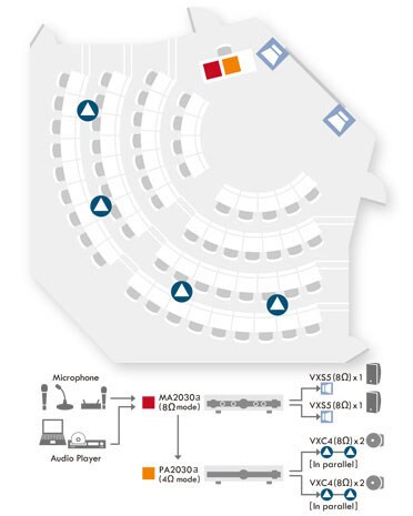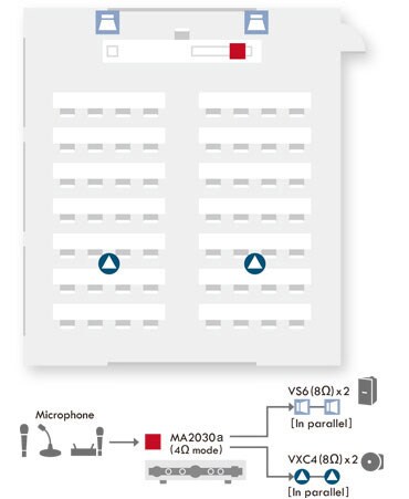 This system is suitable for use in lecture halls, conference rooms. An MA2030a is used in 8Ω mode and a PA2030a is used in 4Ω mode, driving a pair of VXS5 surface mount speakers (8Ω each) and four VXC4 ceiling speakers (8Ω each) respectively. Multiple microphones can be connected to the MA2030a, and overall output level in the room can be easily controlled via the front-panel volume knob.