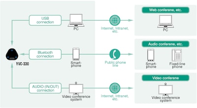 Equipped with various interfaces such as NFC compatible Bluetooth connection and Audio IN / OUT as well as USB, YVC-330 can be flexibly connected to any conference system with smartphones, tablets, video conferencing systems, while the simultaneous use of "USB + Bluetooth + Audio IN / OUT" (Audio mixer function) is also possible.