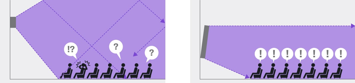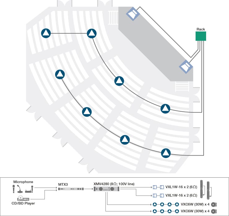 Line array speakers offer excellent projection as well as uniform volume and sound quality over a wide service area, making them a great choice for multipurpose halls, lecture halls, conference rooms, and other facilities that require maximum intelligibility throughout the listening area.