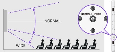 Vertical coverage can be adjusted via a rear-panel switch. Setting the switch to “Wide” expands the dispersion angle in the downward direction only, improving coverage at the front of the listening area in situations where the speakers are installed at a high location.