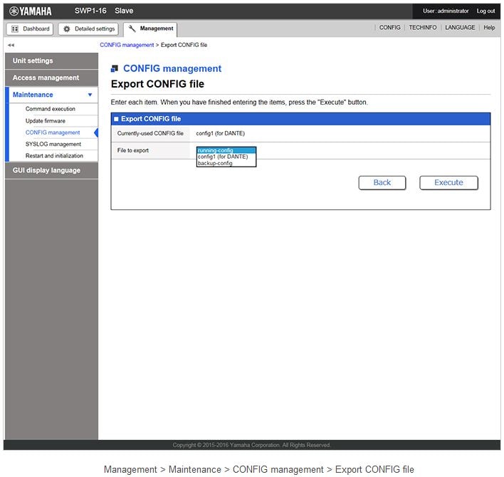 First, in the following page, you can back up the "running-config" settings of a switch that you have finished configuring by exporting them as a text file on your PC.