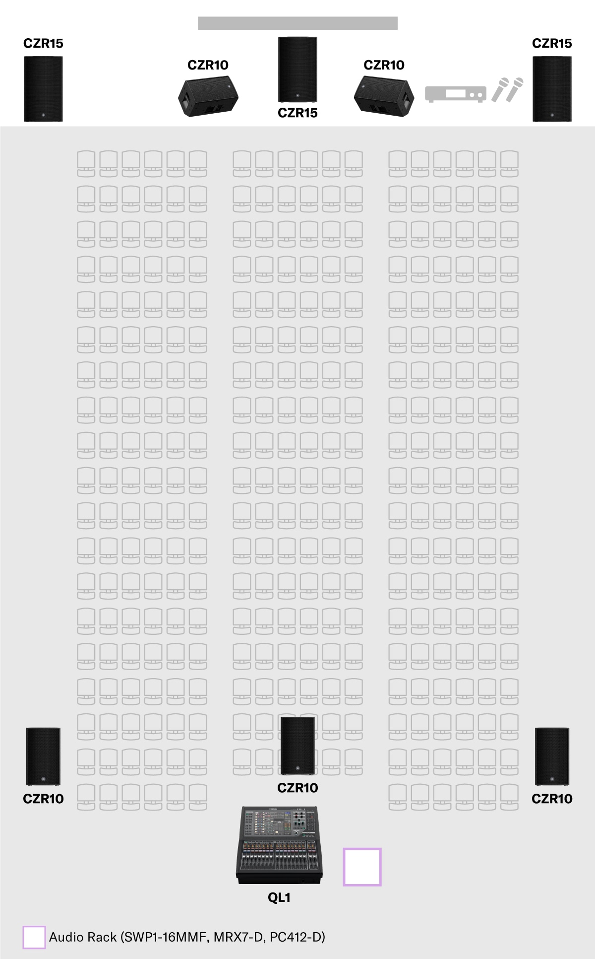 Constructing a system centered on a Dante-compatible mixer also allows flexible support for venues such as auditorium. The CZR series offers both high sound quality and powerful output, and allows horn rotation for optimal coverage whether installed vertically or horizontally. The PC-D series power amplifiers come equipped with CZR series presets for easy configuration of ideal DSP settings.