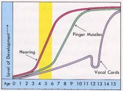 The Yamaha method of music education incorporates weekly group lessons designed to give students the best beginning possible for the development of basic music skills. Emphasis is placed on ear training and the development of a good rhythmic sense. A variety of activities, including singing words and solfege, keyboard playing, sight singing, sight playing, ensemble work and musical creativity are part of the curriculum. Yamaha Music Foundation has completed much research illustrating that a child’s ear develops most rapidly between the ages of four and six (as shown in the graph below). Since hearing development is so closely related to learning music, this is the ideal time to start developing music skills. Accompanied by the parent, as the parent is the essential link between the class experience and successful practice at the home, both child and parent can both share the joy of learning music with one another.