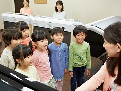 Group lessons are a major feature of Yamaha Music School. Children get in sync with one another, perform ensembles together, and listen to their friends' performances. A certain joy, excitement, and motivation that cannot be experienced through individual lessons enhances the growth of children in various ways.