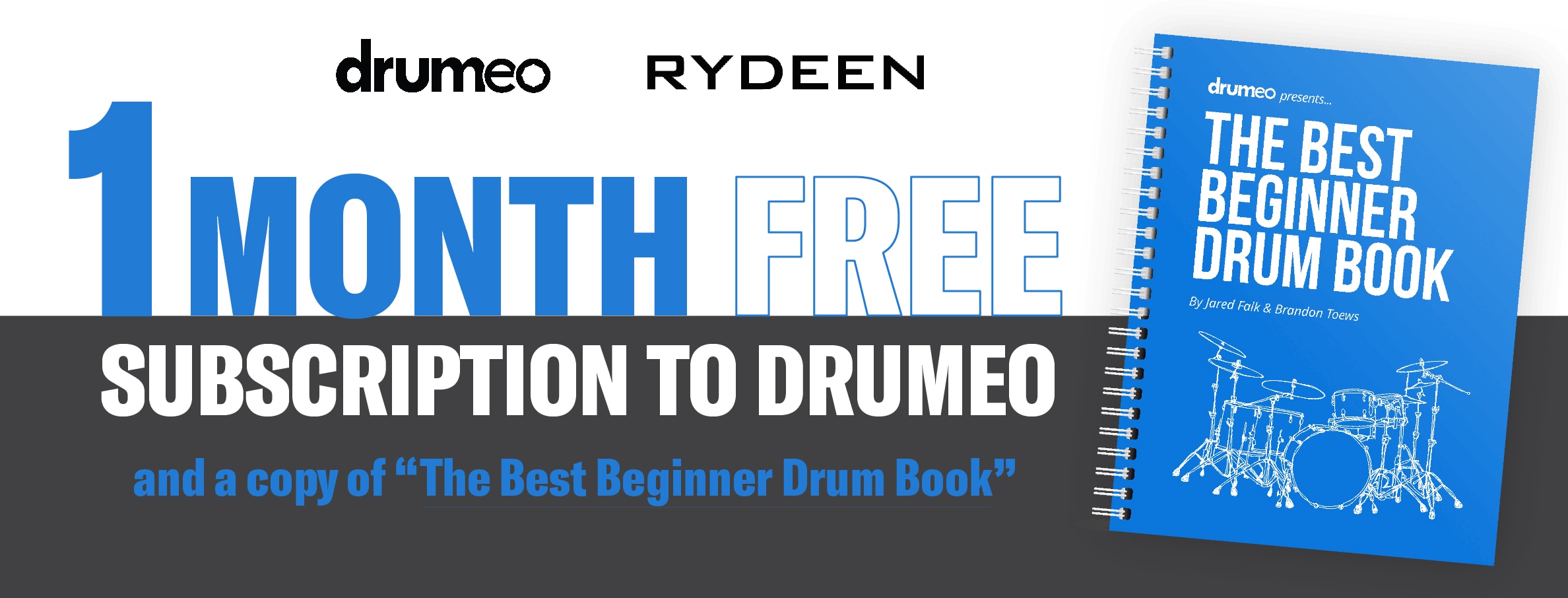 Starting April 1 2024, when you purchase any Rydeen drum set you will receive in the box a FREE copy of Drumeo's “The Best Beginner Drum Book”, described as “the simplest guide for beginner drummers to get started and take their drumming to the next level.” In addition and as an exclusive inclusion, you will also receive a free one-month subscription to Drumeo. Drumeo offers an industry-leading online education experience. Blending technology with traditional lessons, users have access to step-by-step video lessons to be watched anytime along with real teachers who support students every step of the way. Rydeen customers also gain access to Drumeo’s massive library of over 6000 popular songs with drumless tracks. A game-changer for home practice! This represents over $60 Value.