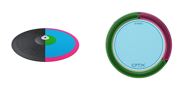 The DTX6 series uses 3-zone pads for snare, crash*, and ride. The snare offers the main articulations - head, closed rim, and open rim - and the cymbals offer edge, bow, and cup triggering. In addition, the cymbal pads can be choked or muted by grabbing the edge. This allows for a variety of performance techniques and lets drummers comfortably practice their accuracy.