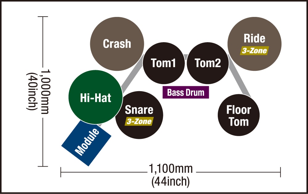 • 3-zone pads for the snare, and ride. The cymbals can be choked and muted. Ride cymbal equipped with a hit point detection function (positional sensing)