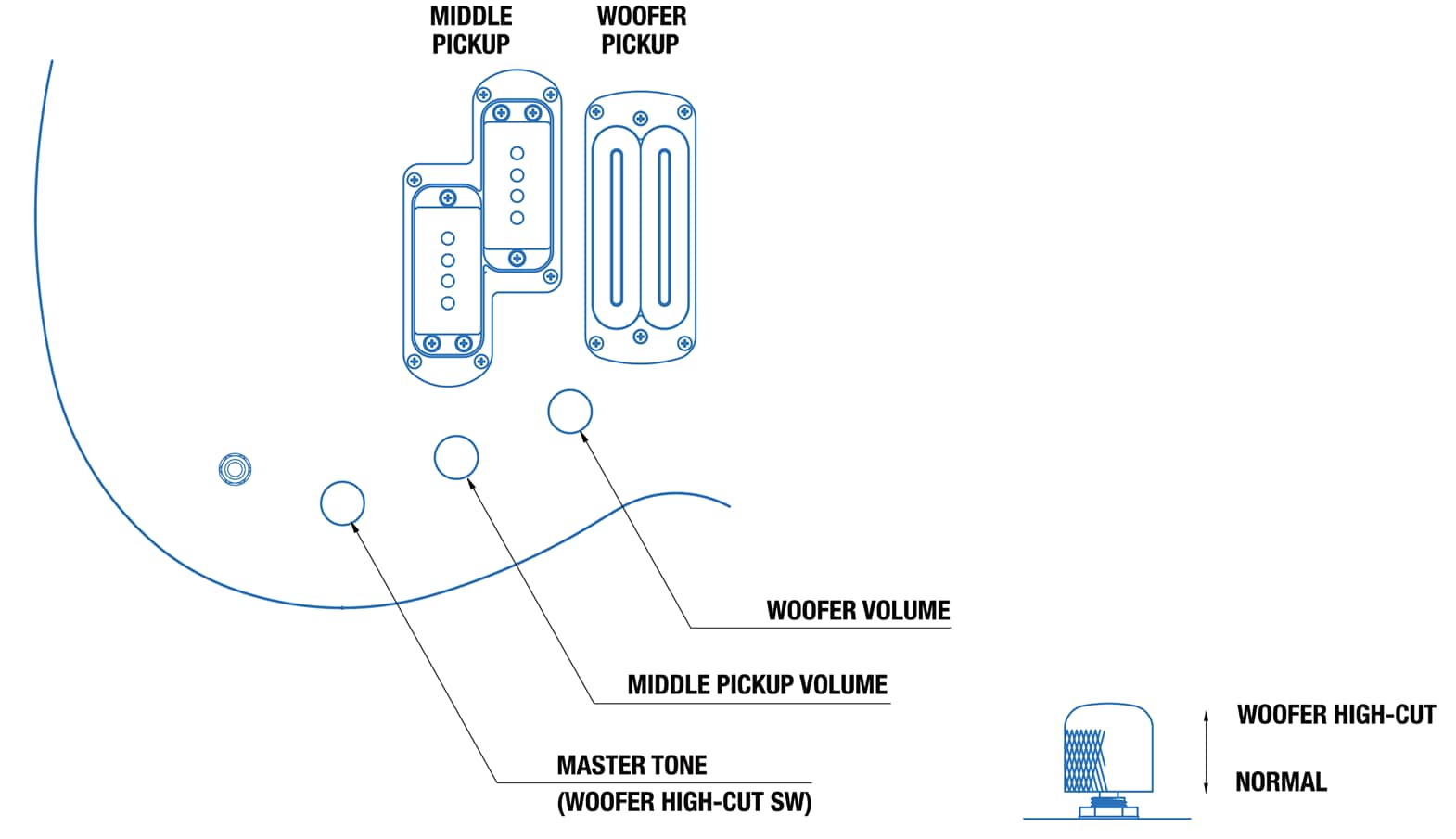 | Controls | Woofer P.U. Volume, Middle P.U. Volume, Master Tone with Woofer P.U. High Cut Switch | ||