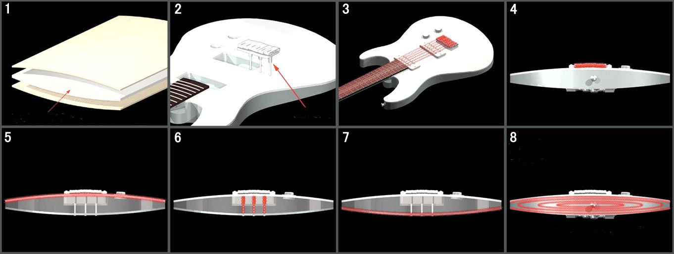 To provide the utmost in functionality, the compact bridge is designed without any protruding parts such as screws, etc. Sound tubes passing through the body underneath the bridge directly transmit string energy to the body.