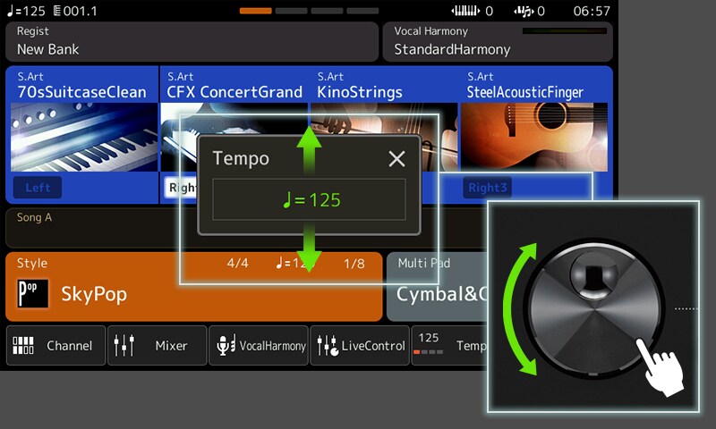 Simply press the [TAP TEMPO] button when playing along with a Styles to easily jump to the beginning of the bar. This Style Section Reset is particularly handy when playing along with a vocalist or performing music with varying time signatures.