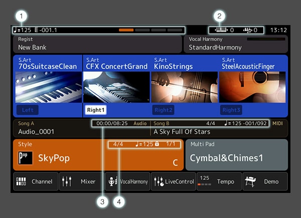 1.Bar/Beat/Tempo: Displays the current position (bar/beat/tempo) in Style playback or MIDI Song playback.