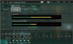 The Envelope Follower converts audio into a control source for control of virtually any synthesizer parameter. For example, a drum loop could drive effects parameters for a cool rhythms or a vocal recording could control multiple parameters for a "talking" synthesizer. The audio can even be a "live" source through the A/D input.