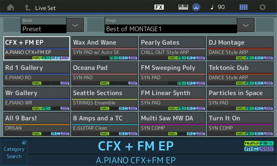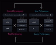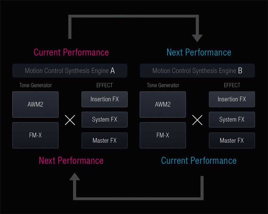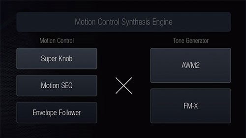 Motion Control Synthesis Engine unifies and controls two iconic Sound Engines: AWM2 (high-quality waveform and subtractive synthesis) and FM-X (modern, pure Frequency Modulation synthesis.) These two engines can be freely zoned or layered across eight parts in a single MONTAGE Performance.