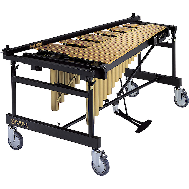 The YVRD-2700(G) multi-frame vibraphone offers the focused sound of the silver satin finish or gold mirror finish aluminum alloy bars with an exceptionally smooth mechanical operation. A one-piece upper frame and dual crossbars allow transport while set-up - while oversized, swivel pedal and height adjustment encourage player comfort.