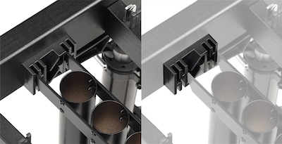 The component receiving the pipe is built to stop the resonator pipe from dropping, even if the pipe itself moves due to vibration during transportation.
