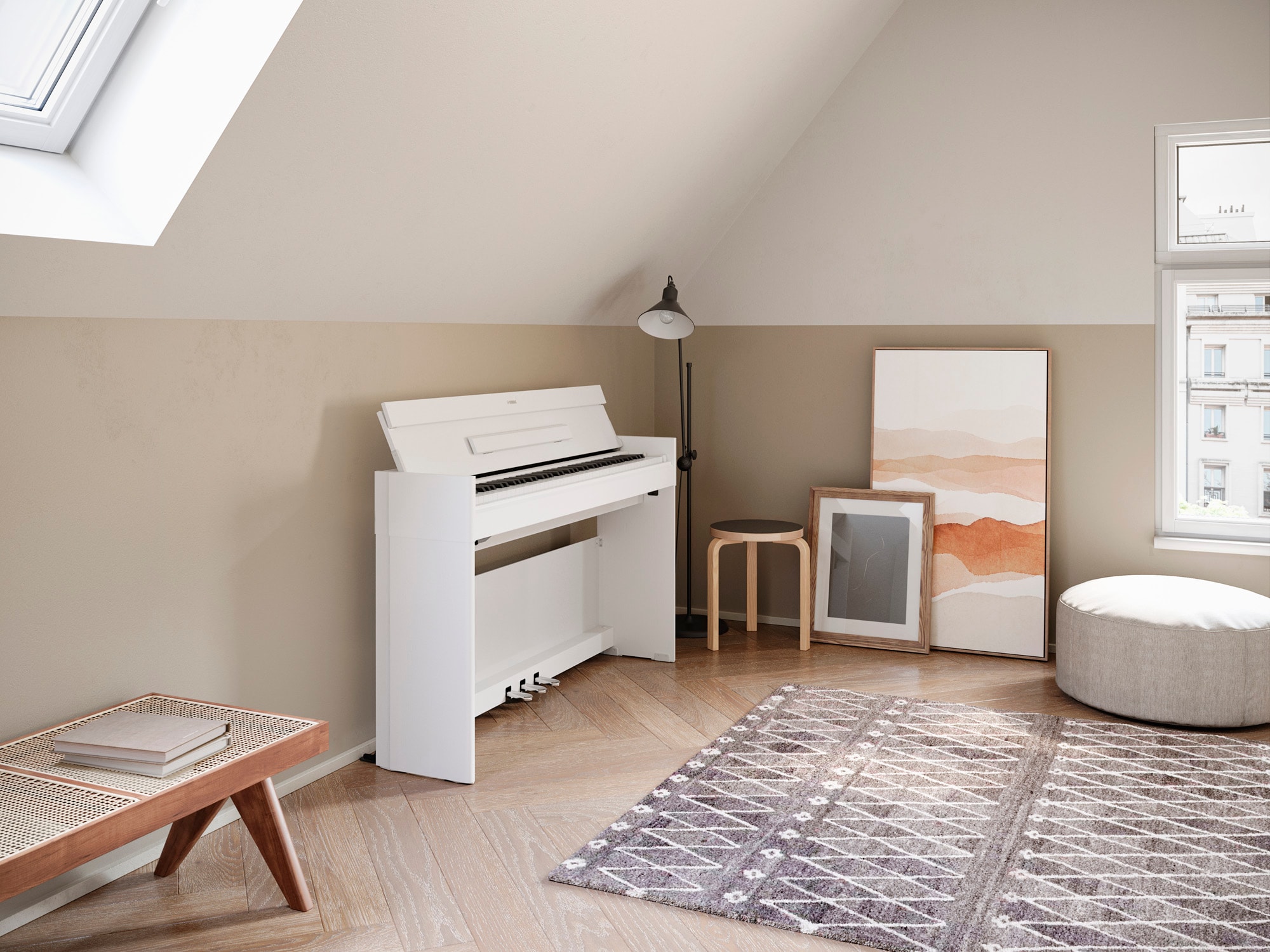 Slim size, 88-key model of the ARIUS digital piano featuring weighted keyboard. With Yamaha's CFX concert grand piano sound as a built-in Voice, experience a luxuriously expressive playing feel with the GH3 keyboard. Includes newly equipped ear-friendly functions, and compatibility with Yamaha’s Smart Pianist app. Lid becomes flat tabletop when closed.
