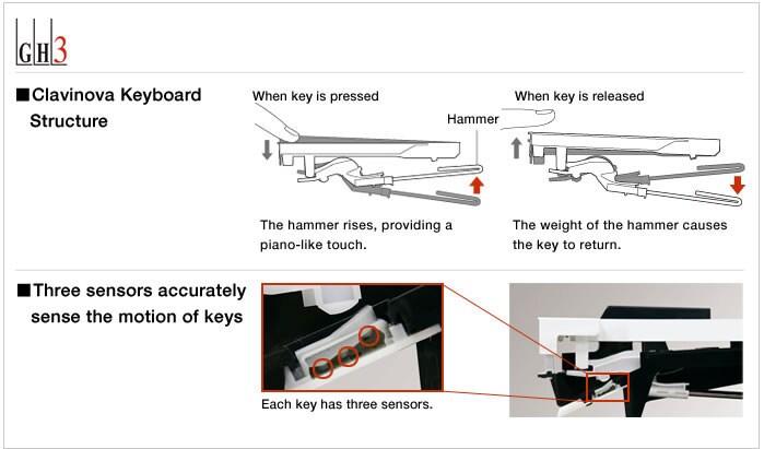 The GH3 (Graded Hammer 3) keyboard faithfully reproduces the touch of a grand piano.