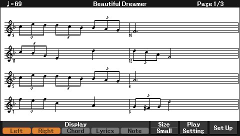 The Lesson features are a fun way to learn and master Songs, with notation shown on the display. For example, when you practice the right-hand part, the playback of the left part and other parts will wait for you to play the notes correctly. This allows you to practice melodies and phrases smoothly—even if you are a beginner.