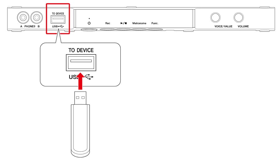 SILENT Piano™ SC2 type can record one song in the internal memory. Additionally, connecting commercially available USB memory to the unit allows you save recording data, and play back songs.